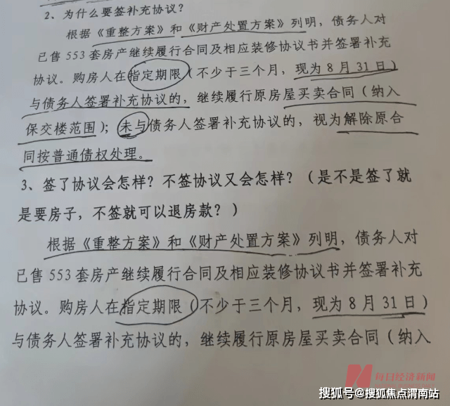 每经记者当日还在现场获得政府专班人员提供的一份文件显示,该补充协议主要与债务人签署,签署的截止日期为8月31日,签署后将继续履行房屋买卖合同(纳入保交楼范围);未与债务人签署补充协议的,视为解除原合同按普通债权处理。