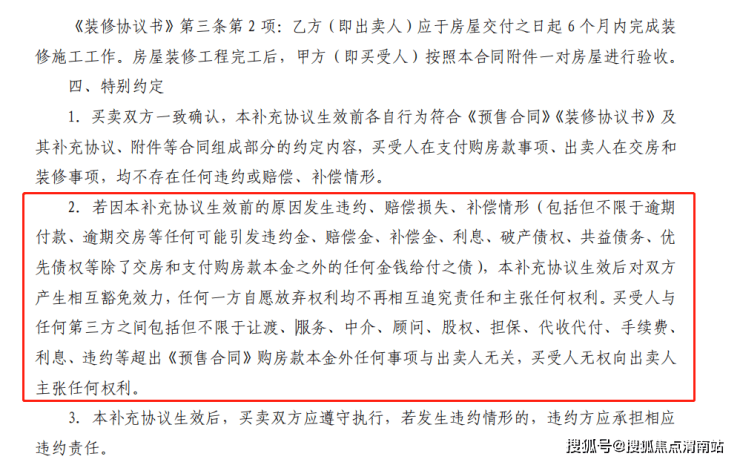 “若因本补充协议生效前的原因发生违约、赔偿损失、补偿情形(包括但不限于逾期付款、逾期交房等任何可能引发违约金、赔偿金、补偿金、利息、破产债权、共益债务、优先债权等除了交房和支付购房款本金之外的任何金钱给付之债),本补充协议生效后对双方产生相互豁免效力,任何一方自愿放弃权利均不再相互追究责任和主张任何权利。买受人与任何第三方之间包括但不限于让渡、服务、中介、顾问、股权、担保、代收代付、手续费、利息、违约等超出《预售合同》购房款本金外任何事项与出卖人无关,买受人无权向出卖人主张任何权利。”
