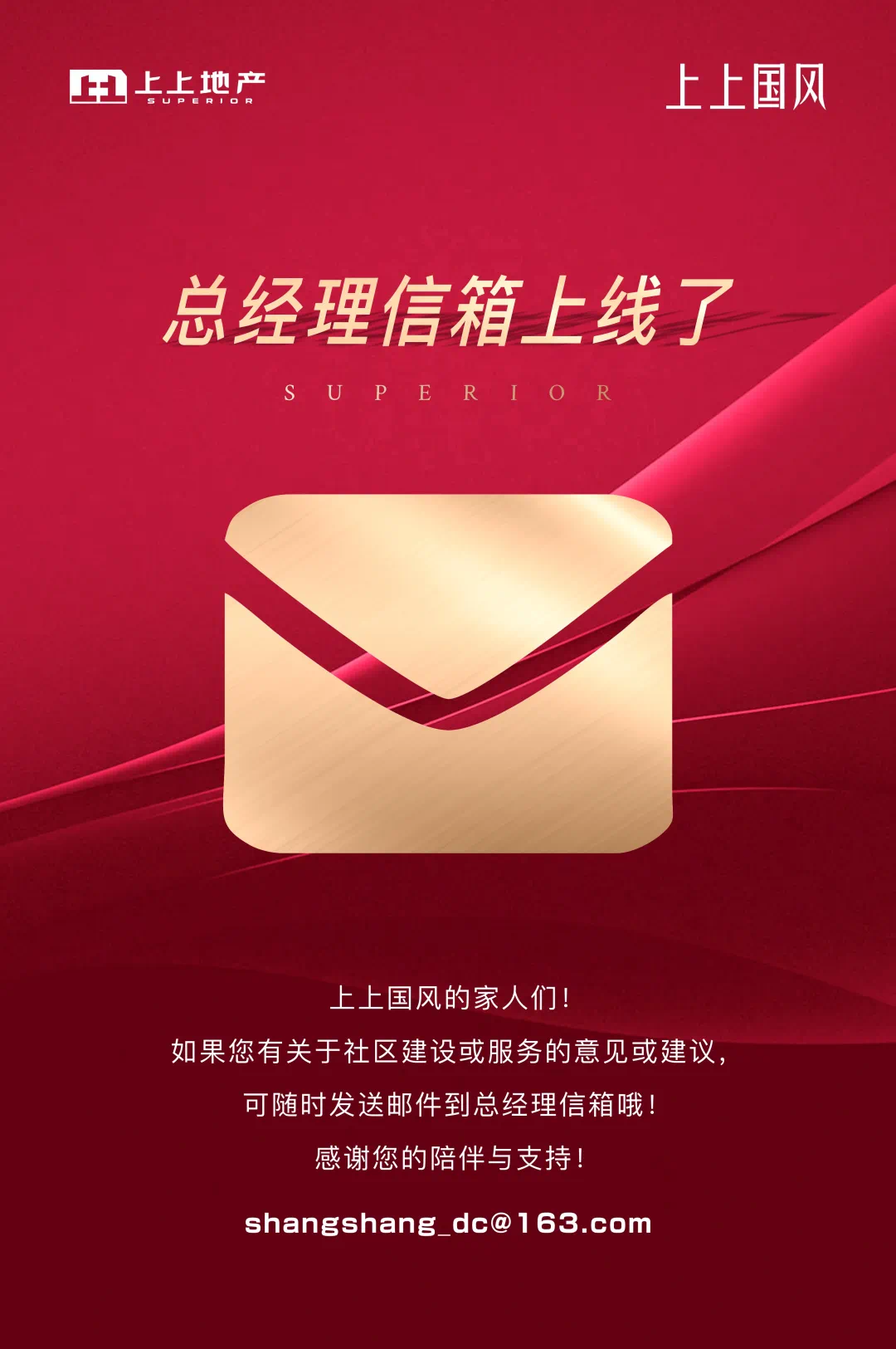 为了给业主提供更好的服务,更贴近业主的生活去服务大家,上上地产特开设总经理信箱!对收房现场的服务不满意?对社区发展的建议或意见?都可以直接发邮件至总经理信箱: